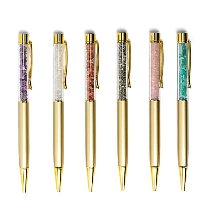Prachtige balpennenset van 6 pennen gevuld met edelsteenchips, waaronder amethist, bergkristal, carneool, pyriet, rozenkwarts en amazoniet.