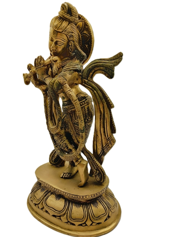 Dit messing beeld van een staande Krishna met fluit is een prachtig kunstwerk dat de godheid in een elegante en levendige houding weergeeft. Het beeld heeft een hoogte van ongeveer 30 cm en straalt een tijdloze schoonheid uit. Krishna staat rechtop met een ontspannen en gracieuze houding, terwijl hij in zijn hand een fluit vasthoudt, klaar om melodieuze klanken te laten klinken. De details op het beeld zijn fijn uitgewerkt, met aandacht voor de sierlijke kleding, sieraden en de kenmerkende krullende haarlokken. Het messing materiaal geeft het beeld een warme, glanzende uitstraling en benadrukt de fijne ambachtelijke details. Dit beeld is niet alleen een spiritueel symbool, maar ook een prachtig decoratief stuk dat een gevoel van rust en devotie uitstraalt.