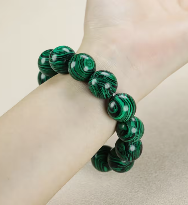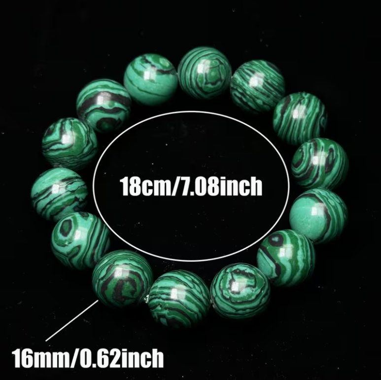 Deze prachtige armband is vervaardigd uit natuurlijke malachietkralen met een doorsnede van 16 mm. De diepe, rijke groentinten van de kralen worden afgewisseld met subtiele patronen en natuurlijke aders, waardoor elke kraal uniek is. De armband straalt een harmonieuze en aardse energie uit, perfect voor wie houdt van een stijlvolle en betekenisvolle accessoire.