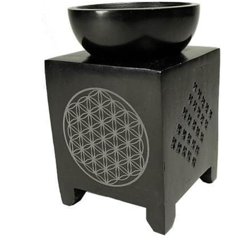 Zwart zeepsteen olieverdamper Bloem des Levens Geurlampje van gepolijst zeepsteen, zware kwaliteit. Zeepsteen is een natuurproduct dat soms donker, soms licht en soms gemarmerd uitvalt. Deze zeepsteen is zwart geverfd. Gedecoreerd met Bloem des Levens afbeelding in grijs. -Olieverdamper zeepsteen Bloem des Levens - 11 - Zeepsteen - Zwart Afmetingen: 11 cm - Maat: L