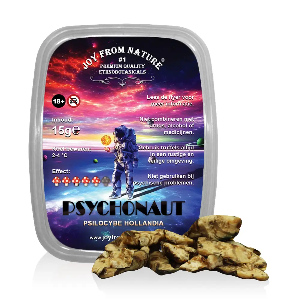Psychonaut Hollandia Magic Truffels zorgen voor een heftige trip die je zo kunnen overdonderen dat je het gevoel hebt dat je uit je stoel vliegt. Gedachtes en visuele effecten springen alle kanten op. Psychonaut (Hollandia) is een zeer sterke truffelssoort, dus deze raden we alleen aan voor de ervaren tripper.