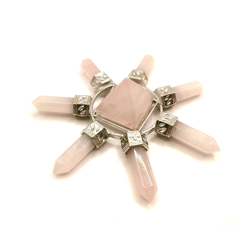 De zeven rozenkwartspunten worden verbonden door een verzilverd frame, dat niet alleen functioneel is om de structuur stevig te maken, maar ook symbolisch. Zilver wordt vaak geassocieerd met zuiverheid, bescherming en het versterken van spirituele energieën. Het metaal verbindt de punten en de piramide, waardoor een geïntegreerd energiesysteem ontstaat dat de kracht van de rozenkwarts versterkt en richt.