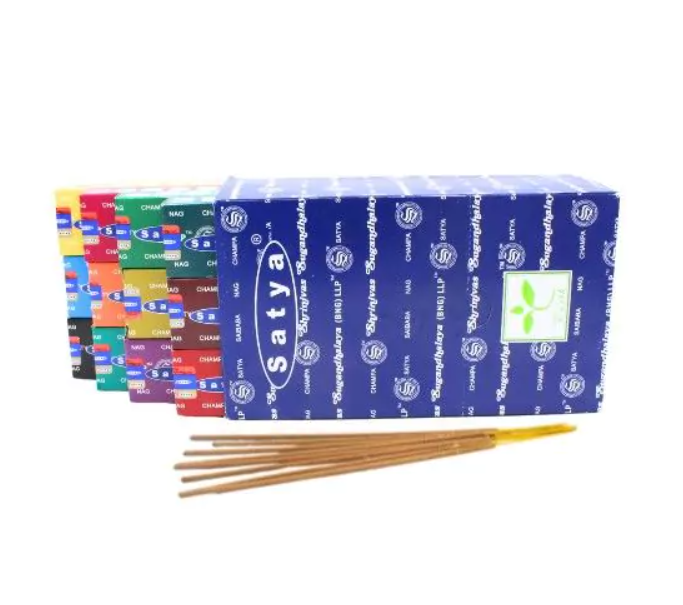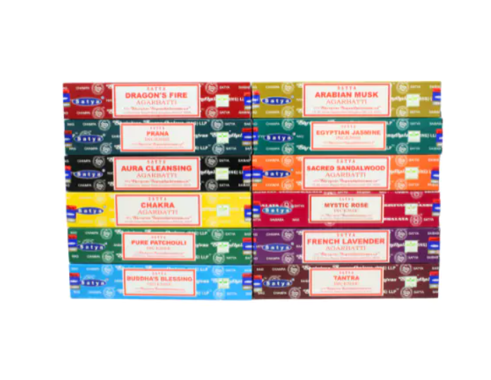 Maak kennis met de geweldige wierook geuren van Satya. De doos bevat 12 pakjes met verschillende geuren.