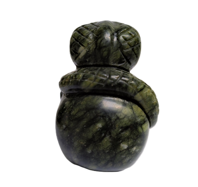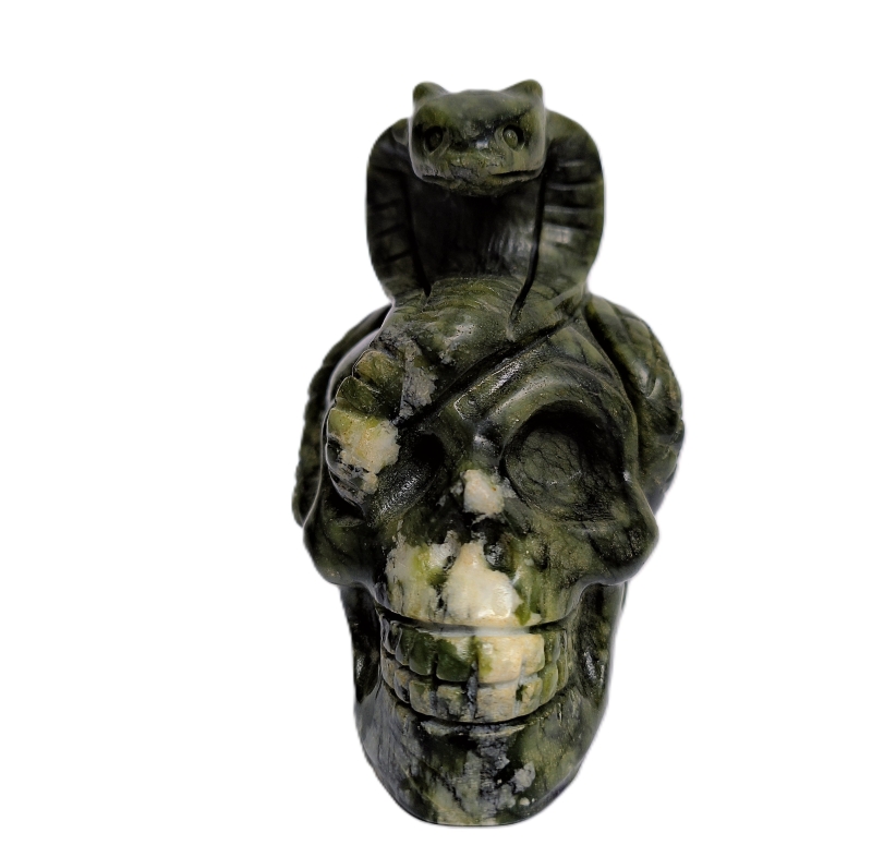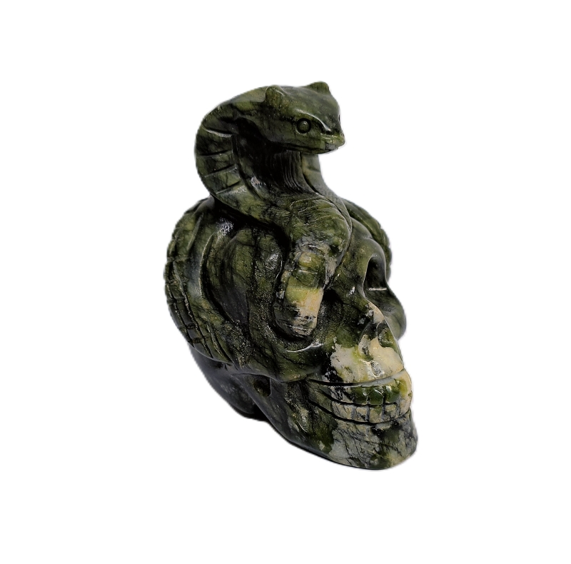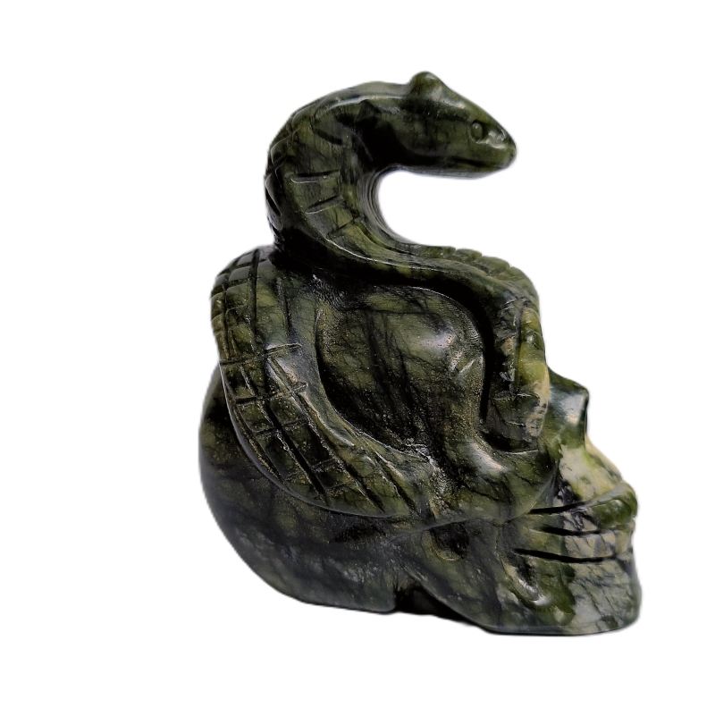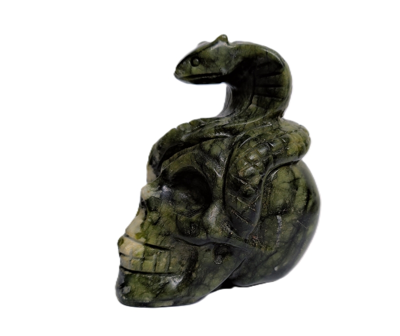 Door de opening van de oogkas kruipt een sierlijke slang. De slang is eveneens uit serptentijn gesneden, met een vloeiende en sierlijke vorm. De slang lijkt zich een weg te banen door de holtes van de schedel, alsof hij de geest of de innerlijke kracht symboliseert die uit de diepten van de geest of ziel omhoog komt.
