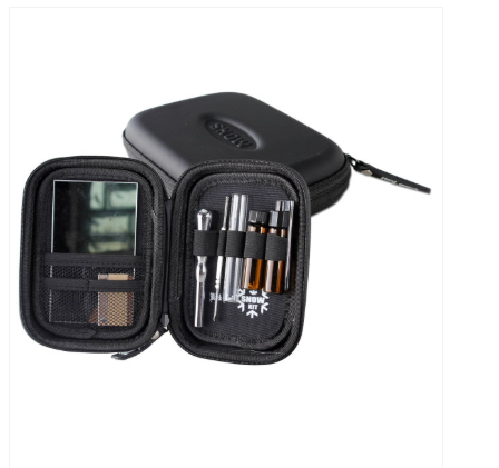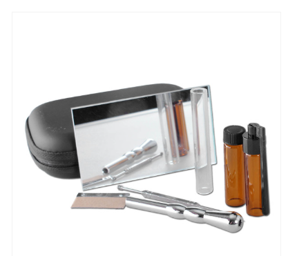 Alles wat je nodig hebt behalve het magische poeder is inbegrepen: spiegel als snuifpad, scheermesje voor perfect gevormde lijnen, glassnuifer, lepel/schraper en twee glazen buisjes met schroefdoppen. De robuuste platte koffer met ritssluiting past in bijna elke tas en is altijd binnen handbereik en gebruik.