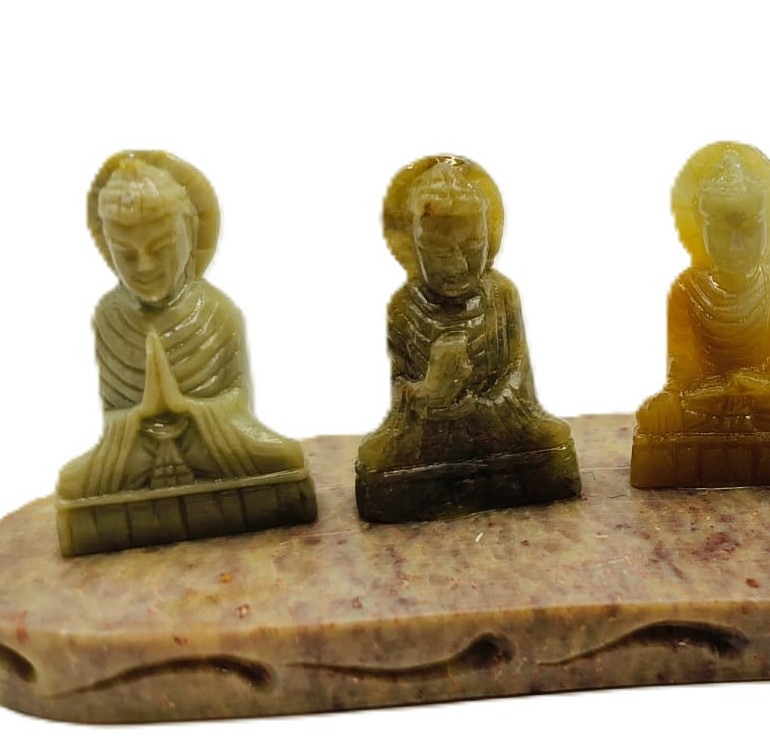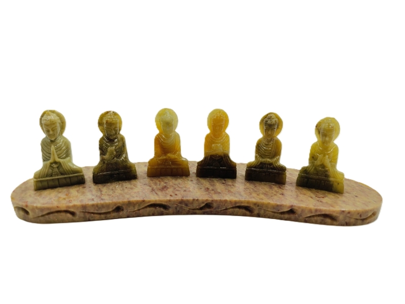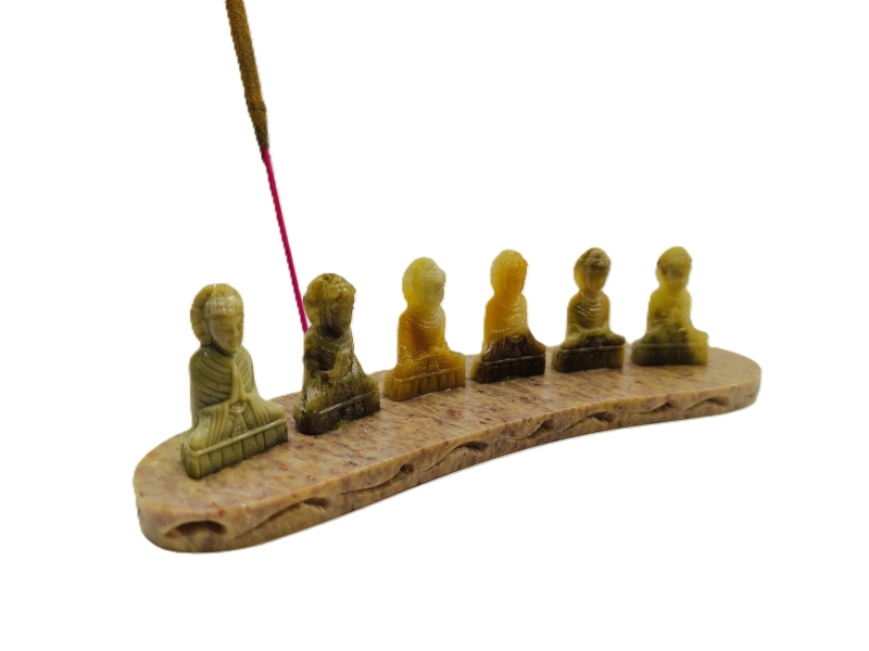 Deze prachtige wierookhouder, vervaardigd uit sfeervolle speksteen, combineert functionaliteit met een artistieke uitstraling. Met een lengte van 16,5 cm vormt hij een elegante toevoeging aan elke ruimte. Het basisdeel is zorgvuldig gesneden en afgewerkt, waardoor het een stevige en stabiele ondergrond biedt voor het branden van wierook. Bovenop het basisstuk bevinden zich zes kleine boeddha's, elk gemaakt van hetzelfde speksteen en elk in een andere mudra (handgebaar). Deze boeddha's symboliseren verschillende aspecten van spirituele groei en innerlijke rust, en brengen een gevoel van sereniteit en harmonie in de omgeving. De natuurlijke kleur en textuur van de speksteen geven de wierookhouder een warme, aardse uitstraling die perfect past bij meditatie- of rustruimtes. Een uniek en betekenisvol stuk dat zowel functioneel als decoratief is.