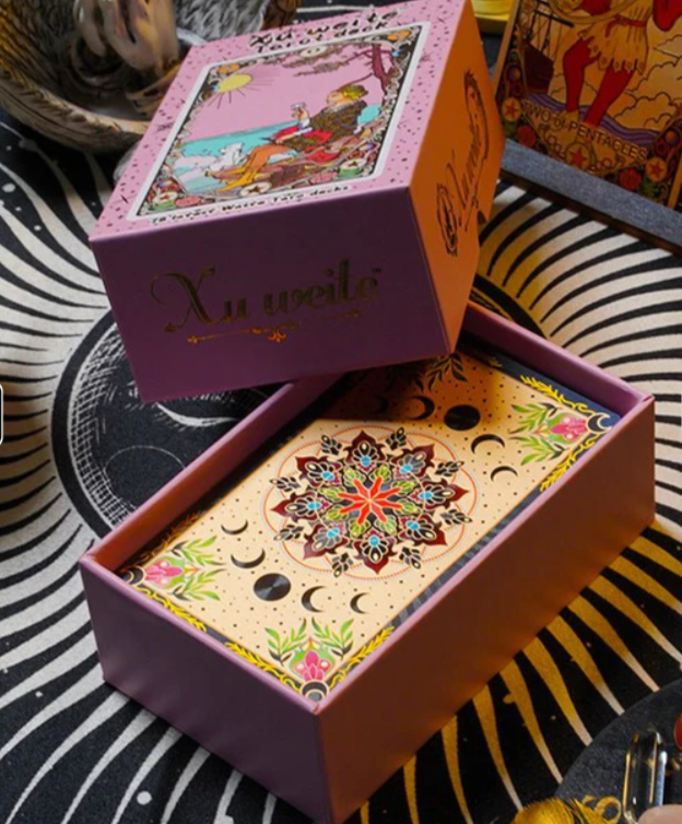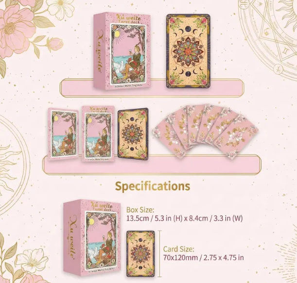 Ontdek de Xu Weite Tarot, een prachtig roze tarotdeck dat het klassieke waarzeggerijsysteem prachtig opnieuw verbeeldt met een grillige art-nouveau-esthetiek. Dit deck is verpakt in een luxe stijve doos en is niet alleen een hulpmiddel voor begeleiding, maar ook een kunstwerk voor je spirituele altaar.