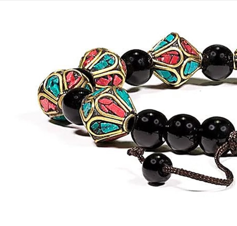 Deze prachtige Tibetaanse armband is vervaardigd uit glanzende zwarte onyx kralen, die een diepe en mysterieuze uitstraling geven. Tussen de onyxkralen zijn sierlijk messingkralen verwerkt, waarin delicate stukjes koraal en turquoise zijn ingebed, wat zorgt voor een kleurrijk en harmonieus contrast. De armband wordt bijeengehouden door stevige touwtjes, waardoor hij eenvoudig te verstellen is en perfect past bij elke polsmaat. Een uniek en spiritueel accessoire dat zowel stijlvol als betekenisvol is.
