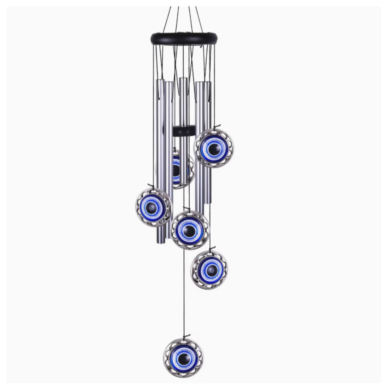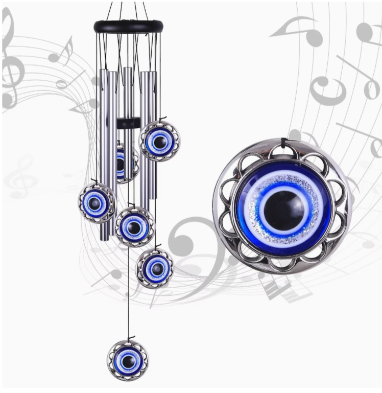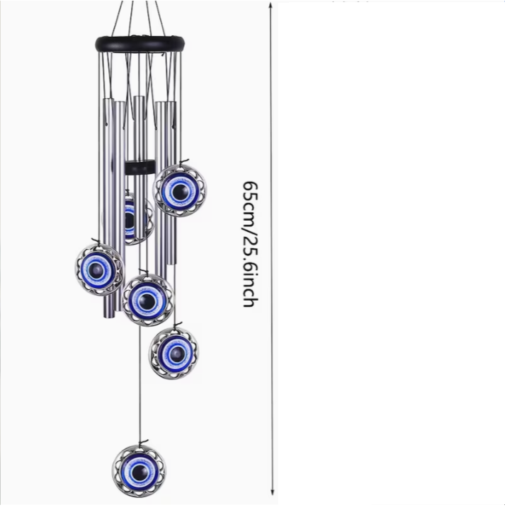 Wat deze windgong extra bijzonder maakt, zijn de sierhangers van het boze oog die aan de onderkant hangen. Het boze oog is een oud symbool dat in veel culturen wordt gebruikt om negatieve energie, jaloezie en kwaad te weren. Door deze symboliek toe te voegen, fungeert de windgong niet alleen als een mooi decoratief object en geluidsbron, maar ook als een beschermend talisman dat negatieve invloeden afweert en positieve energie bevordert.